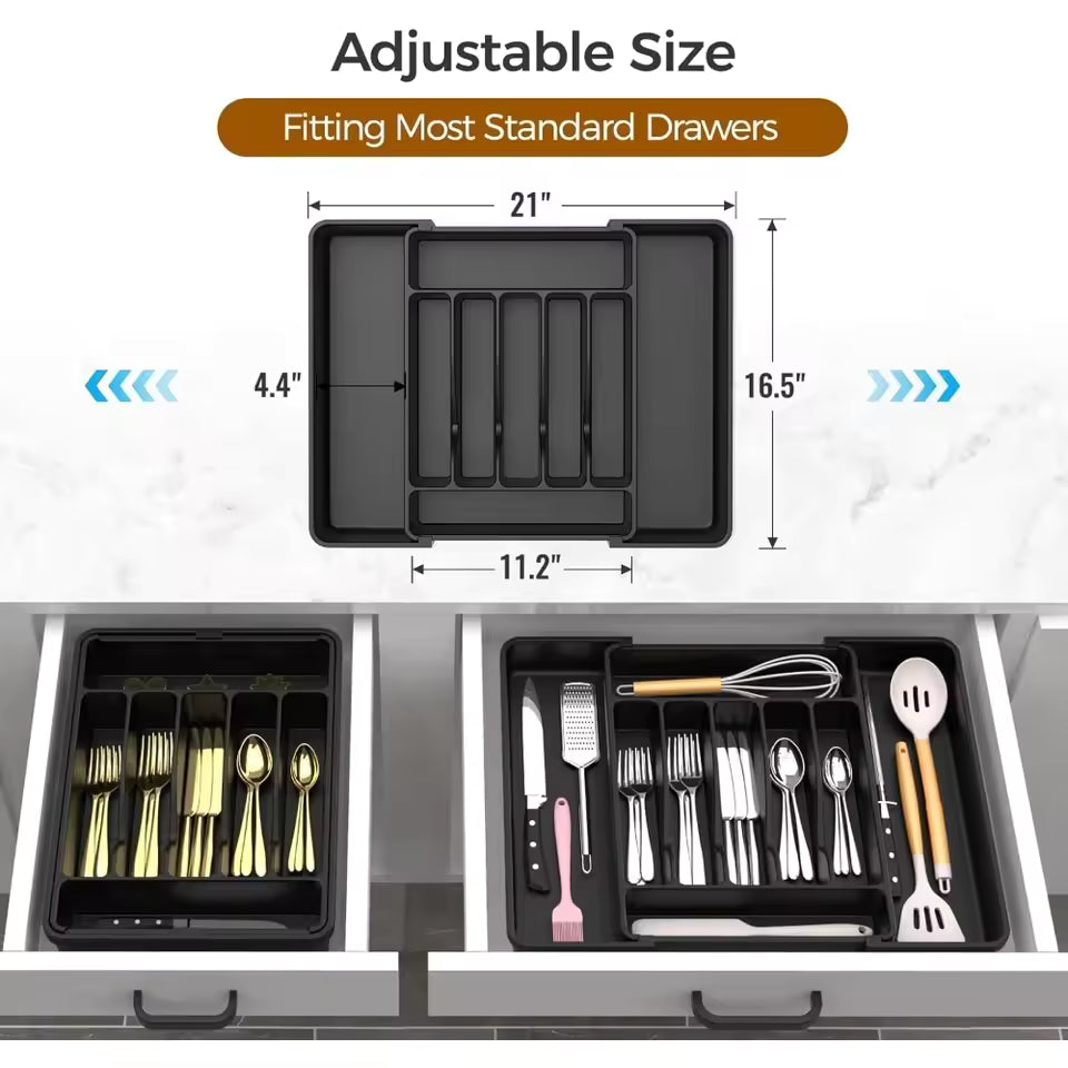 Why settle for cluttered drawers when you can enjoy the convenience of a well-organized kitchen? The Extra Large Expandable Silverware Organizer not only accommodates full cutlery sets but also adapts to your storage needs with its expandable design. Whether you need it for kitchen utensils, cosmetics, jewelry, or office supplies, this versatile organizer is ready to assist you.