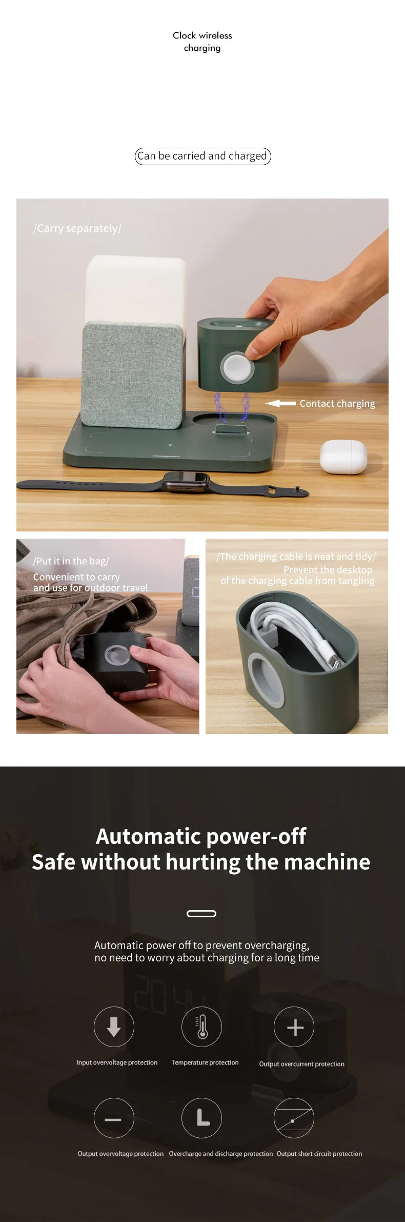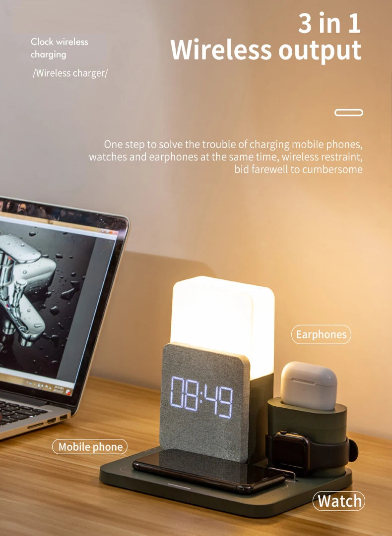 Experience the ultimate convenience with the innovative 4-in-1 fast wireless charger station that seamlessly integrates a charging dock, alarm clock, and adjustable lamp. This multifunctional device allows you to charge multiple devices simultaneously, keeping your workspace organized and stylish. Say goodbye to tangled cords and cluttered surfaces, and hello to a sleek solution that enhances your daily routine.