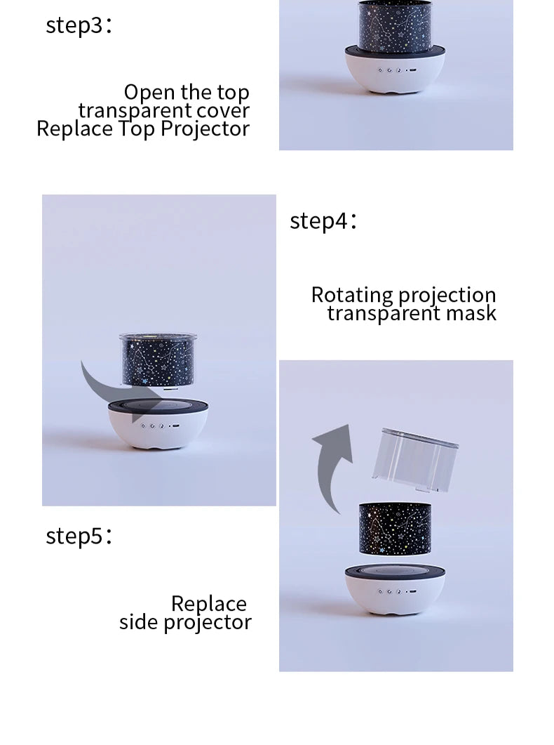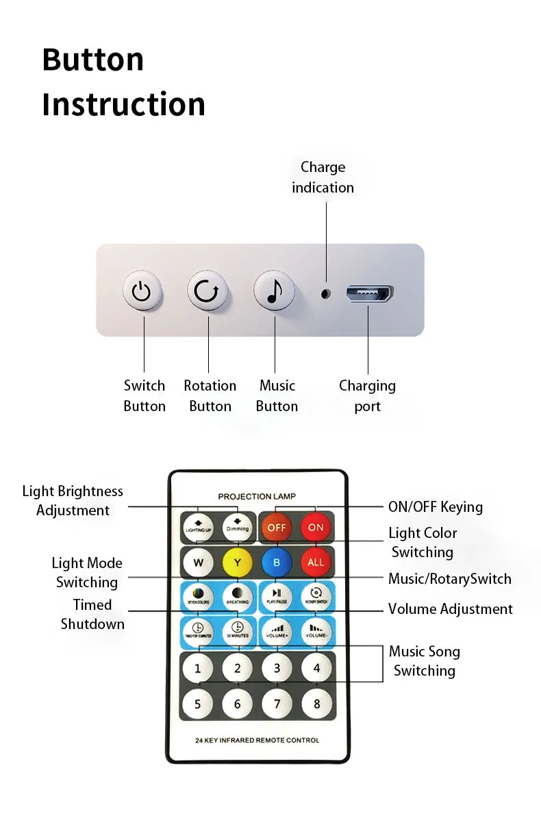 - Projection Modes: Colored star sky, planets, and simple animal/shape patterns